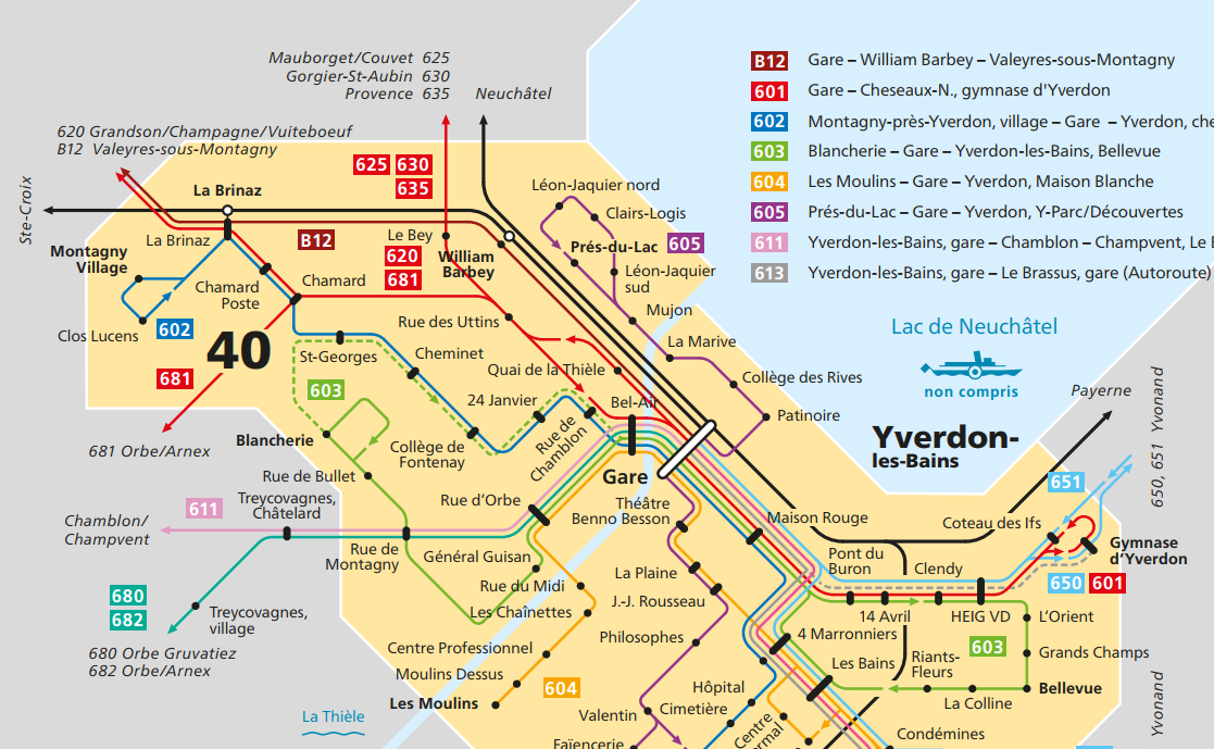 Exemple concret : Avec un abonnement Mobilis couvrant les zones 40, 46, 121, 47, 114 et 120, voyagez sans restriction sur Yverdon–Ste-Croix, y compris sur le réseau urbain d’Yverdon-les-Bains.